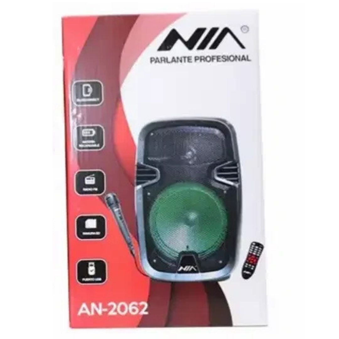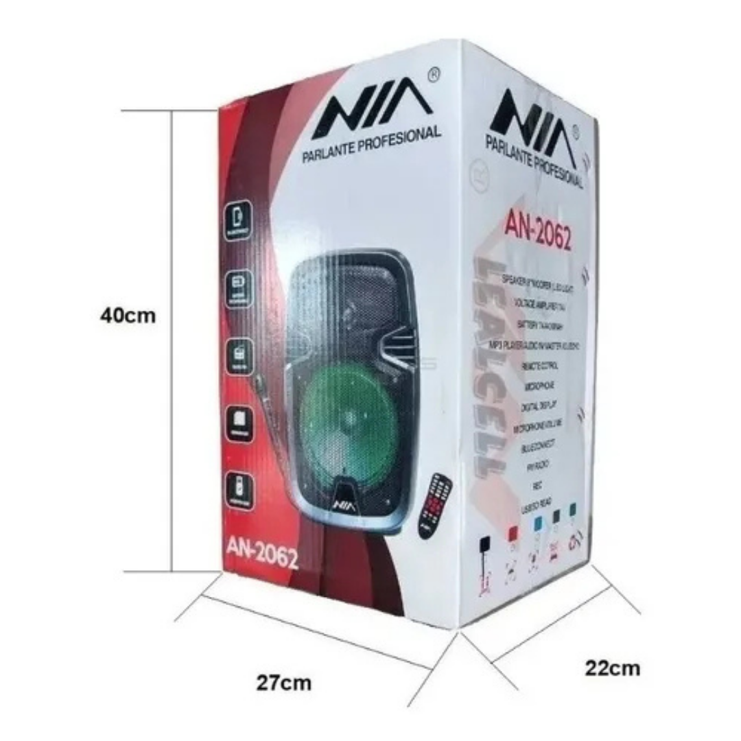 Disfruta de un sonido nítido, contundente y con gran potencia en cualquier lugar con la Cabina NIA A-2062. Con sus 250W PMPO, woofer de 8” y batería de hasta 8 horas de autonomía, es perfecta para tus fiestas, reuniones o eventos. Además, integra Bluetooth, USB, SD, Radio FM, luces LED y función TWS para conectar dos cabinas sin cables. ¡Incluye control remoto y micrófono alámbrico!