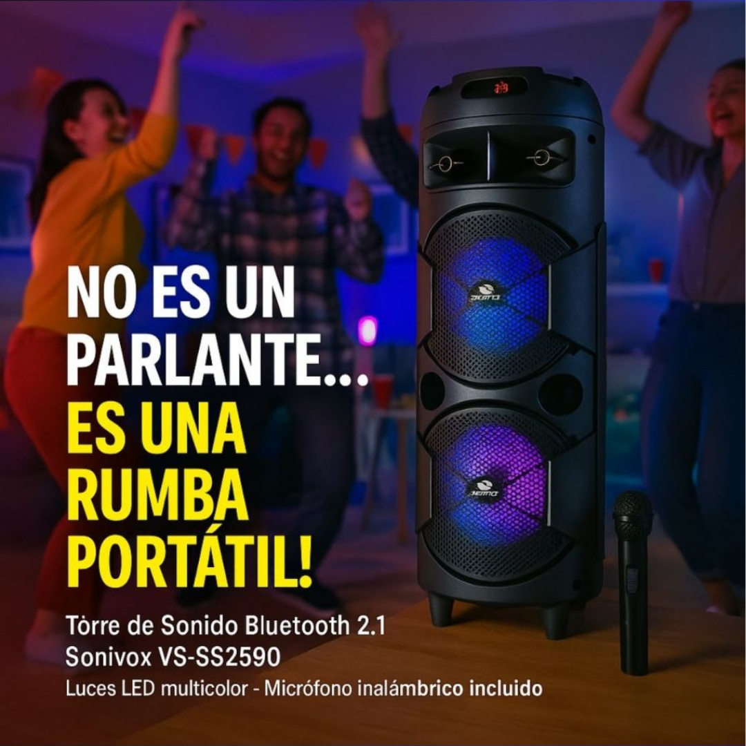 Con 11.000W de sonido, 2 subwoofers de 8" y tecnología X-Bass, la Torre Sonivox hará vibrar tus reuniones, fiestas y eventos como nunca antes. Además, incluye micrófono inalámbrico y entrada para guitarra, ideal para cantantes, DJs y músicos.